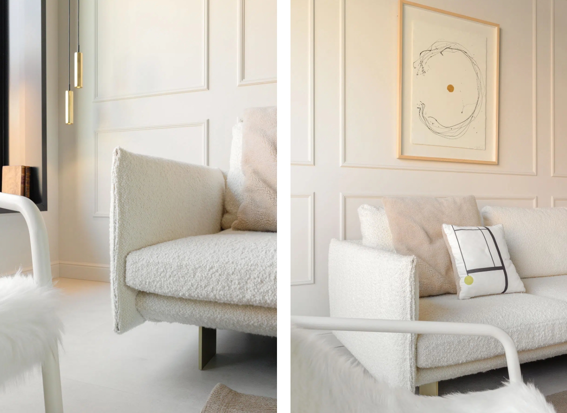 최소한의 공간을 차지하면서도 최고의 편안함을 제공하기 위해 고안된 합리적인 디자인입니다. 각진 직선과 직각으로 이루어진 상자 모양의 외관과는 달리, 내부는 볼록한 곡선으로 이루어져 있습니다. 좌석 구조는 지지력과 견고함을 유지하면서도 마치 사라진 듯 매끄럽게 경사지게 디자인되었습니다. 쿠션의 박스형 디자인은 고전적 합리주의를 연상시키며, 내부 패딩 구조가 드러나도록 분리되어 있습니다.